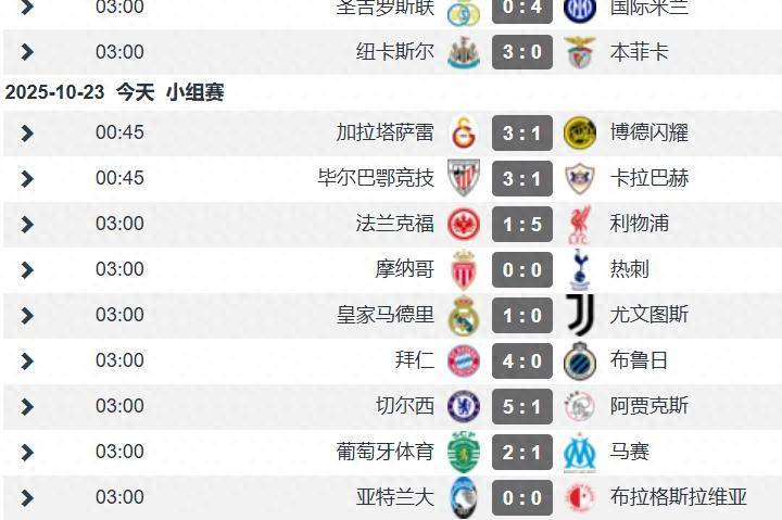加拉塔萨雷3-1博德闪耀:奥斯梅恩双响,博德闪耀是主场人工草球队,客场战绩往往拉胯。毕尔巴鄂竞技3-1卡拉巴赫:古鲁泽塔双响,强弱分明的对决。法兰克福1-5利物浦:萨拉赫沦为替补,埃基蒂克弑旧主,维尔茨助攻双响,利物浦大胜终结四连败。摩纳哥0-0热刺:巴洛贡错失单刀,维卡里奥神扑救主,热刺客场带走1分已是好运。皇马1-0尤文图斯:两队门将都是门闩,贝林厄姆制胜,弗拉霍维奇错失单刀。拜仁4-0布鲁日:17岁前腰卡尔世界波,三大前锋凯恩&迪亚斯&杰克逊破门,左后卫莱默尔一人独造3球,攻防一体。切尔西5-1阿贾克斯:蓝军续写英超战力,19岁的吉乌和乔治破门,恩佐和埃斯特旺点射破门,客串右后卫的凯塞多建功,完全一边倒的比赛。葡萄牙体育2-1马赛:葡超劲旅击败法甲领头羊,上轮法甲大四喜格林伍德首发半场哑火被换下,法甲欧战还要看大巴黎。亚特兰大0-0布拉格斯拉维亚:奥迪隆错失单刀,卡内塞基精彩扑救,一场0-0闷平,但合计射门38脚(22-16),踢得热门,射术很差。意甲除了国际米兰,本轮欧冠都是送人童子。